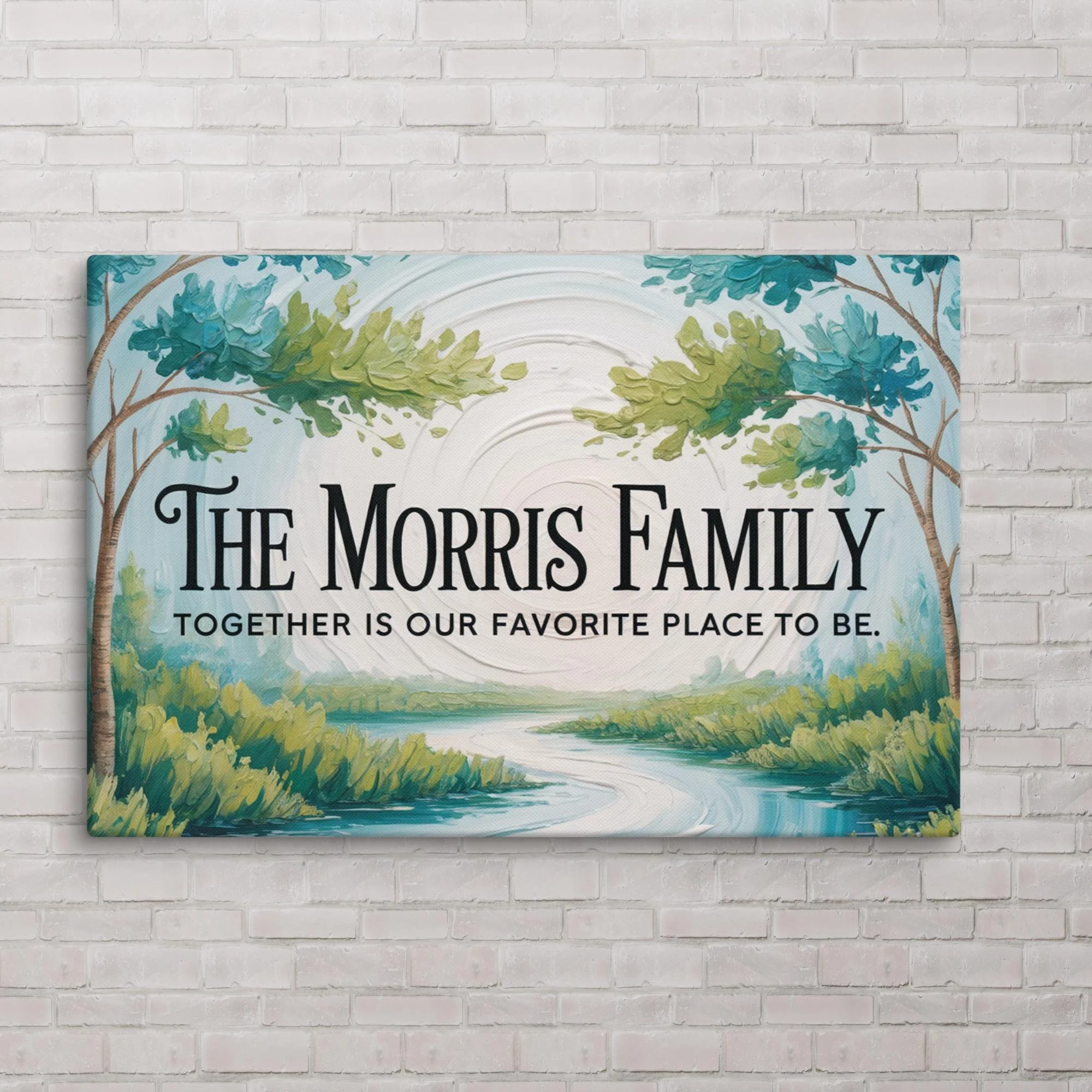 The design is a print in an oil painting style, giving the artwork a rich, textured appearance that symbolizes the depth, continuity, and artistry of the Morris family’s shared story.