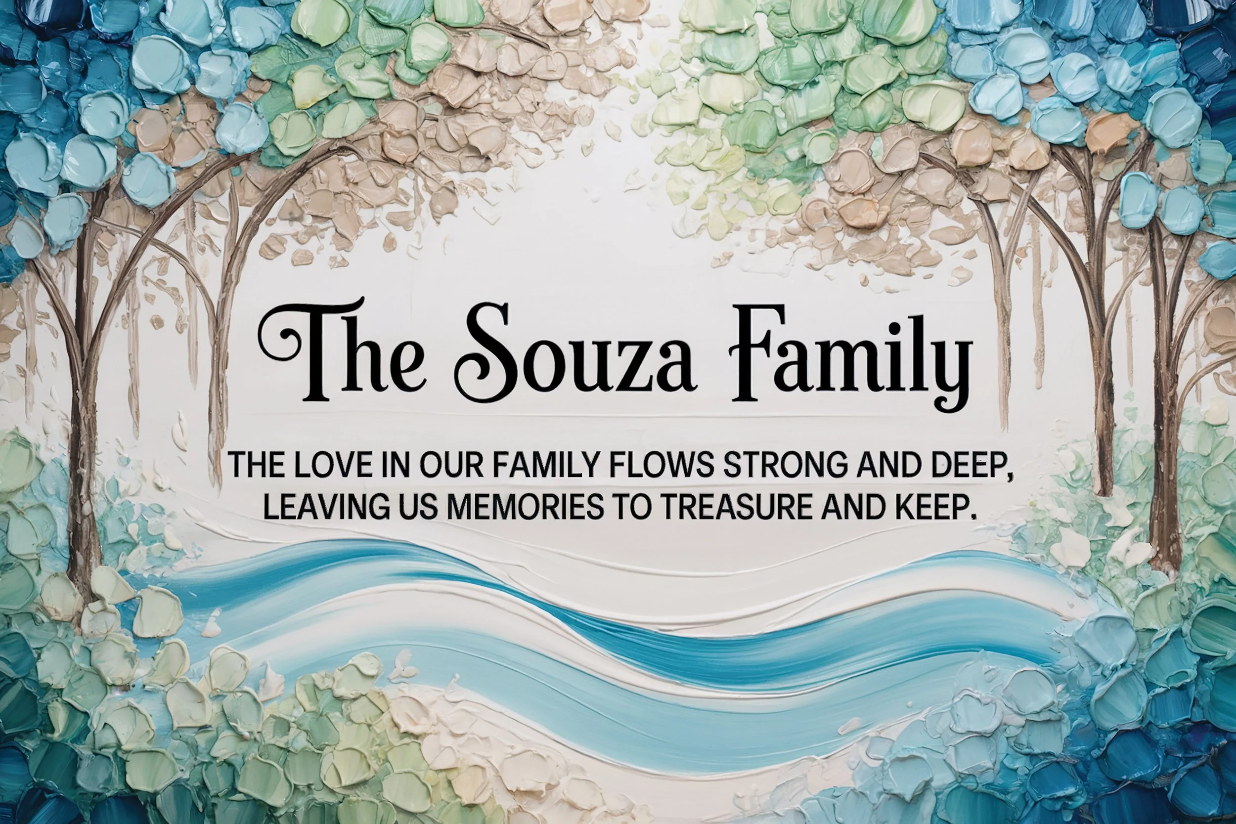The Souza name, with its Portuguese roots, evokes tradition, loyalty, and a heartfelt connection to family—qualities that continue to thrive across generations. The Souza Family Framed Name Plaque proudly features the touching and heartfelt quote: “The love in our family flows strong and deep, leaving us memories to treasure and keep.” The design is a print in an oil painting style, giving the artwork a rich, textured appearance that symbolizes the depth, grace, and enduring current of family love.