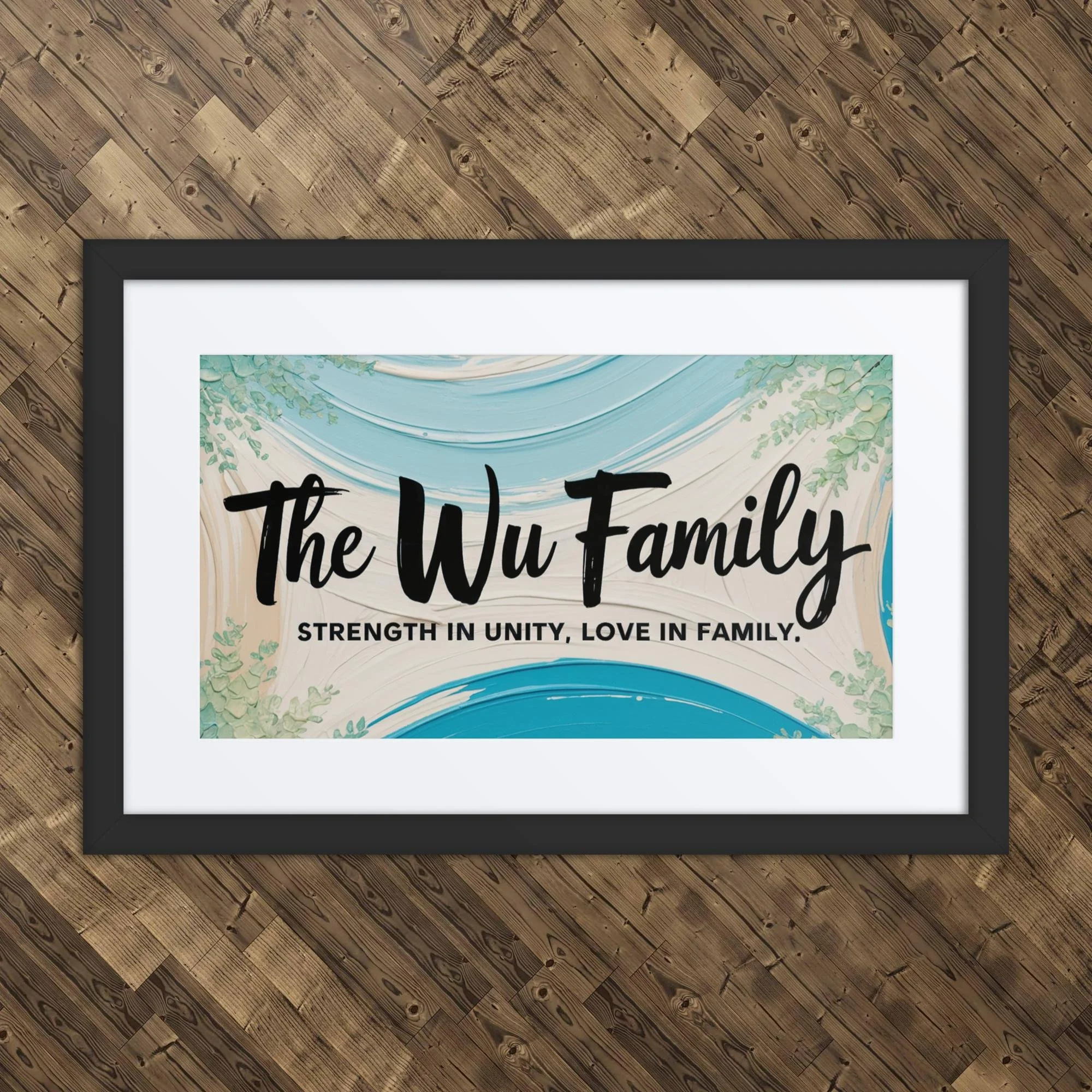 The Wu Family Framed Name Plaque proudly features the timeless and empowering quote: “Strength in unity, love in family.” The design is a print in an oil painting style, giving the artwork a rich, textured appearance that symbolizes the deep bonds and enduring beauty that grow stronger with every shared moment.